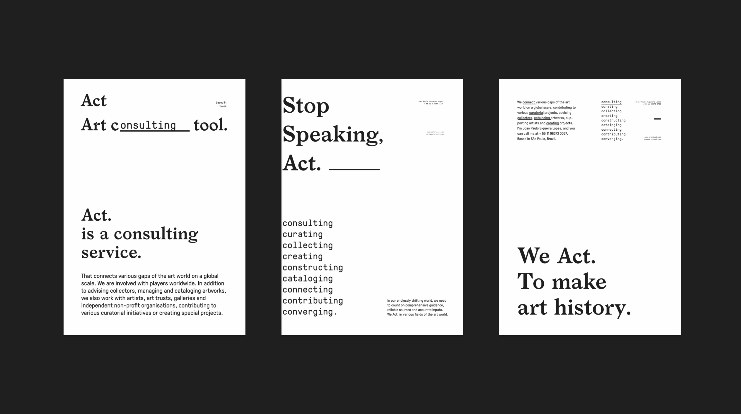 Act. Is a consulting tool that specializes in several fronts in the arts circuit. Its services are intended for collectors, artists, art foundations and non-profit institutions, contributing to various curatorial initiatives or creating special projects.